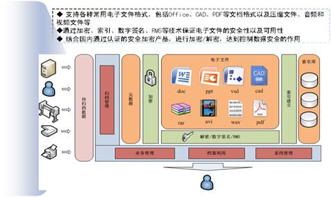 系统全面支持CAD图纸、JPG、BMP、TIF、PDF以及Office等主流文件格式的直接浏览、打印等操作及流媒体文件的直接播放;严密的电子文件权限管理,可实现单份文件的单独授权阅读、编辑、打印、下载等操作;多种电子文件存储方式供用户选择,支持网络共享、FTP服务器和数据库存储、支持电子文件OCR识别、全文检索、缩略图等功能。
